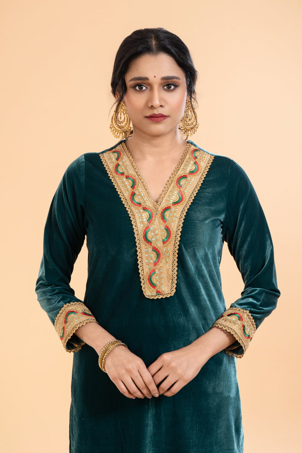 Ishira – Luxe Emerald Green Velvet Kurta Set, exquisite embroidery