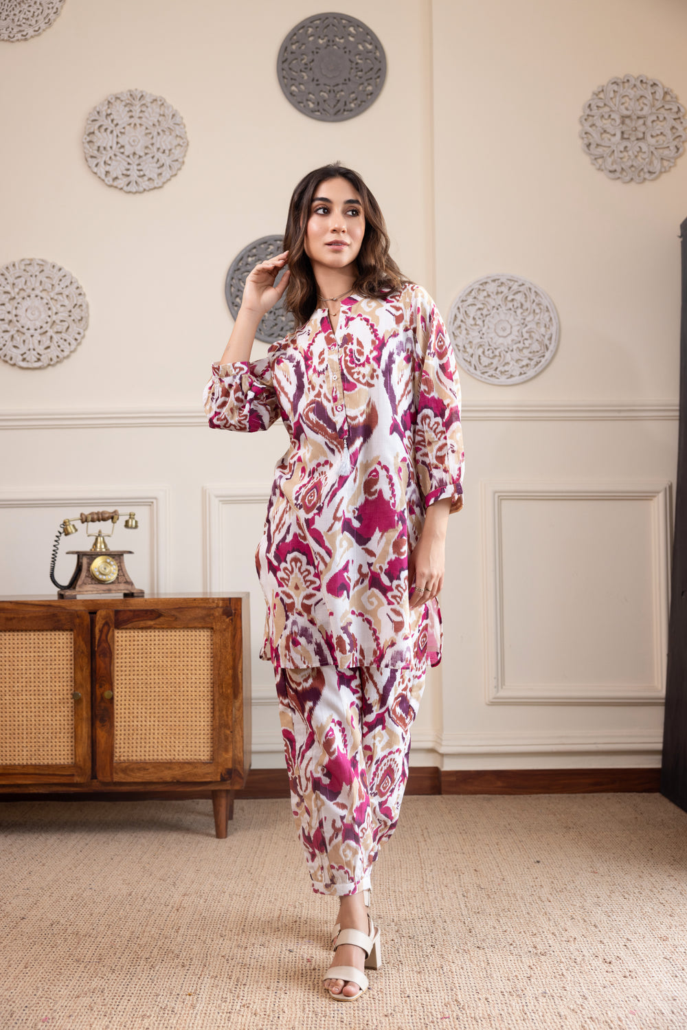 Be the center of attention in our Purple & Pink Shimmer Co-ord. Made with cotton-lurex fabric and cotton lining inside, this kurta and salwar set is perfect for adding a touch of glamour to any occasion. Turn heads with the shimmering shades of purple and pink in this stylish and comfortable ensemble.