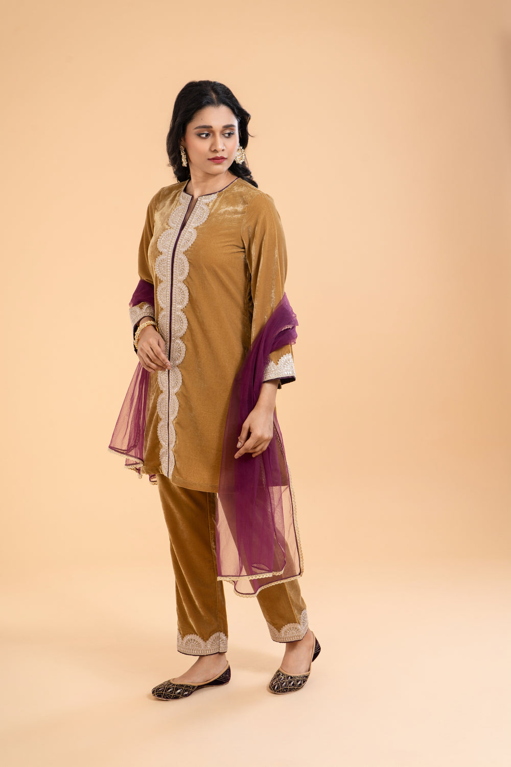 Ruqsar – Mustard Gold Velvet Kurta Set with Plum Dupatta, Straight Cut Kurta, Embroidery