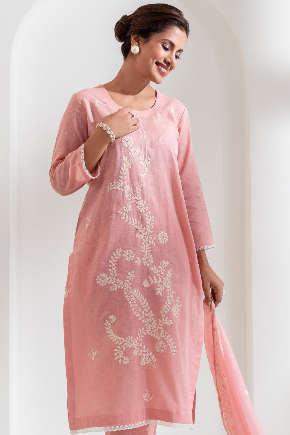 Indulge in this premium cotton linen set with intricate embroidery and handcrafted details on the top and a luxurious woven silk jacquard dupatta with elegant tassels. A masterpiece in craftsmanship.