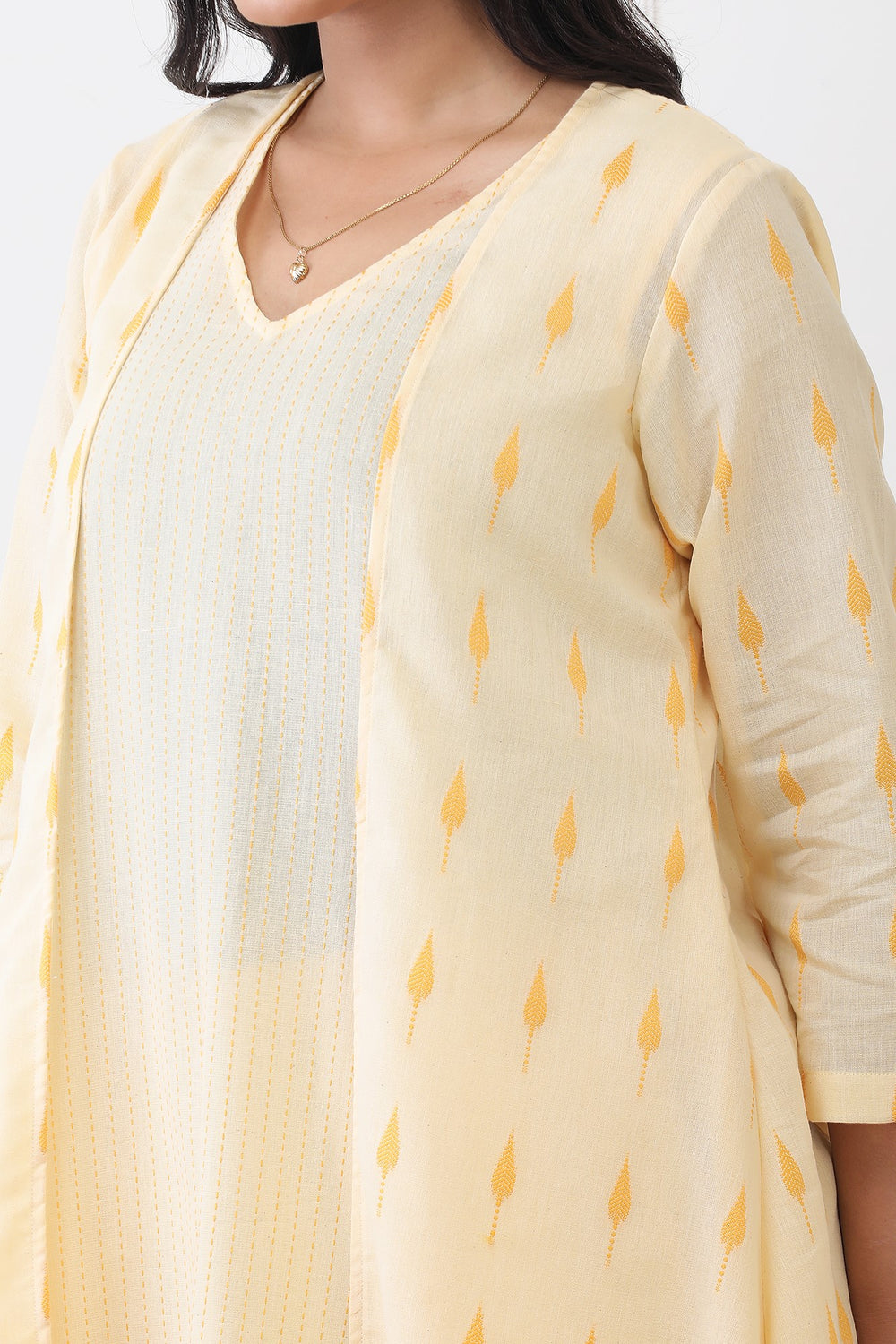 Woman wearing a yellow kurta with white patterns on a white background