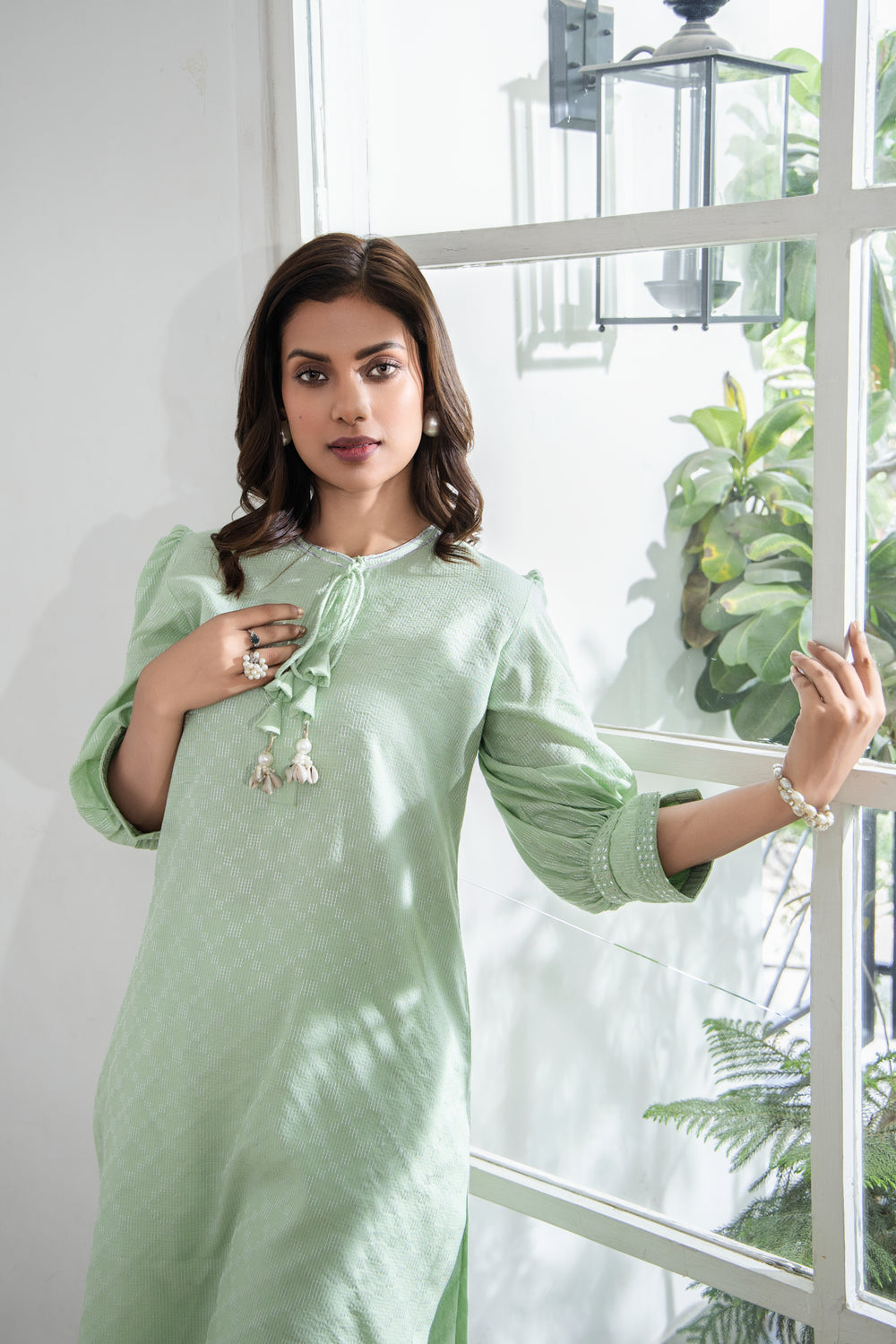 The kurta has a round neckline with an interesting tie-up detail featuring white tassels, adding a playful touch. The puffed three-quarter sleeves complement the lightweight, subtly textured fabric.